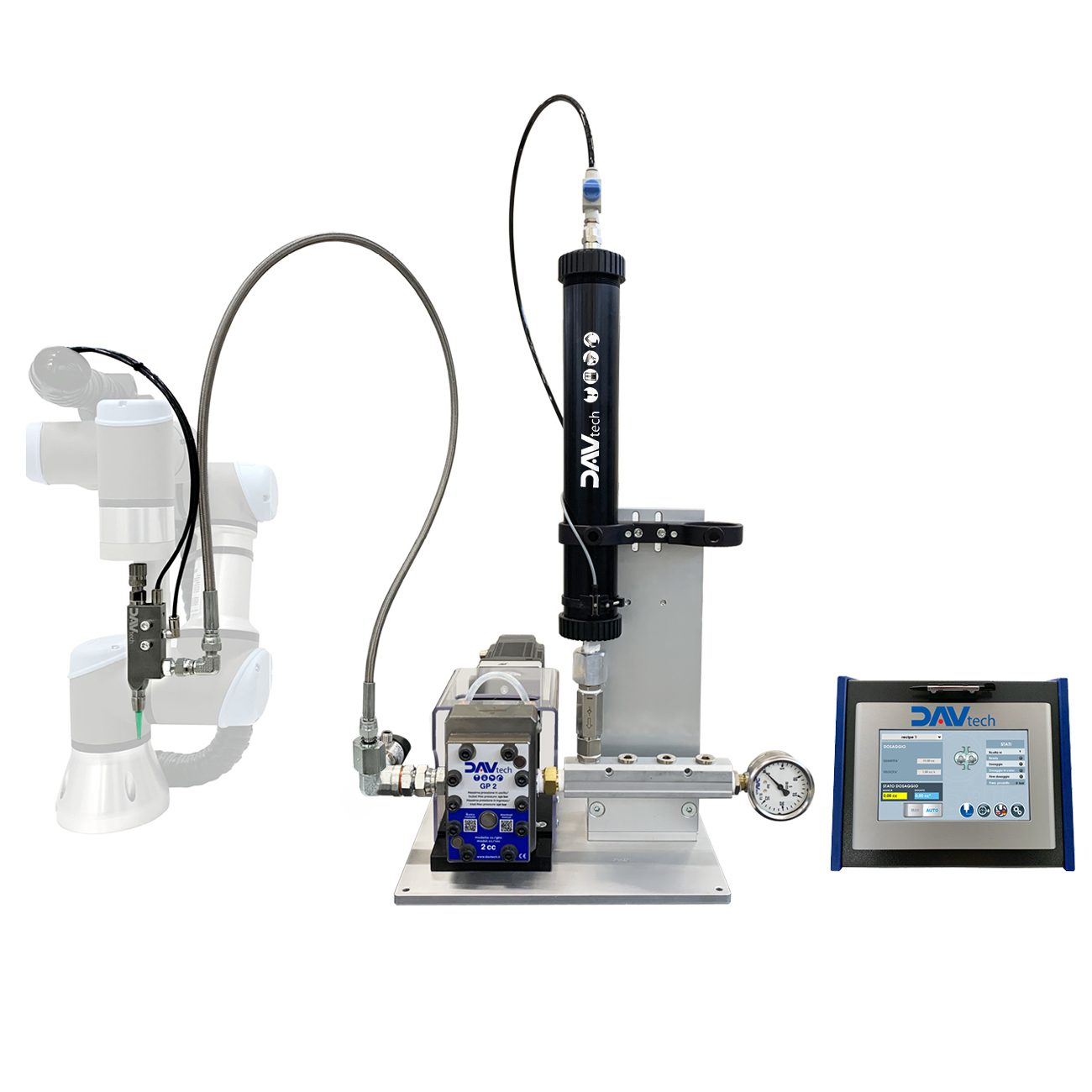The GP volumetric pump, controlled by a servo motor, manages the quantity and flow rate of each individual dispensing.