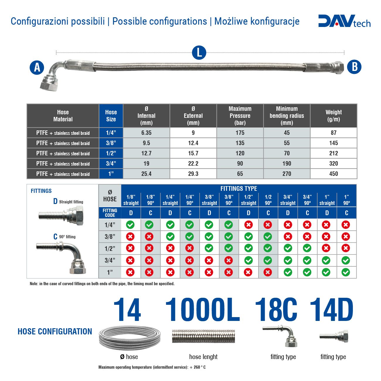 I tubi corazzati DAV Tech possono essere prodotti con diametri e soprattutto lunghezze completamente configurabili. La treccia in acciaio protegge ed irrobustisce un tubo interno realizzato in PTFE, che è l’unico materiale che combina doti di alta scorrevolezza all’impermeabilità dall’umidità, risultando quindi ideale per il passaggio di quei materiali, come i siliconi, che reticolano in presenza di umidità.